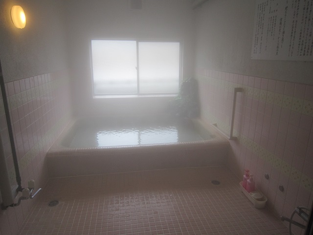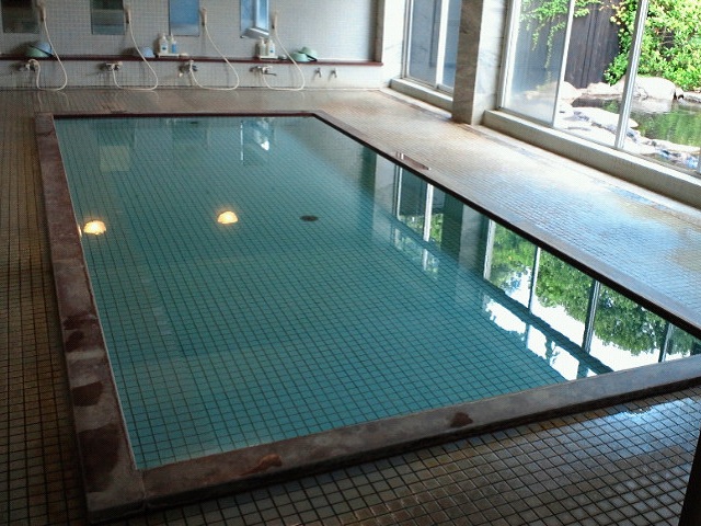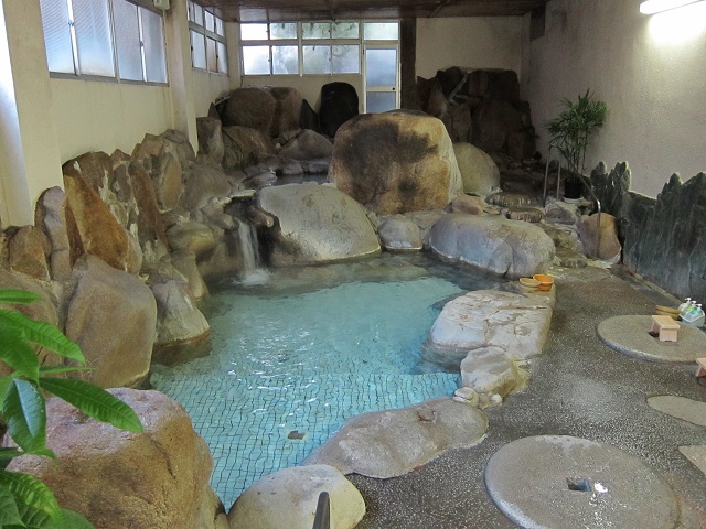 湯免温泉「湯免観光ホテル別館(大衆浴場)」。名前とは裏腹に(?)別館は鄙びています。料金250円は受付で支払います。タイル張りの浴槽は訪れた時間が早かったからかかなり熱めでした。男湯はひょうたん型浴槽とか、女湯は長方形でした。