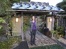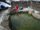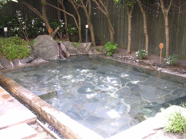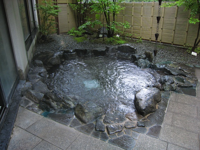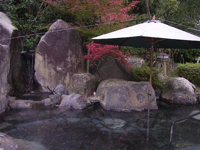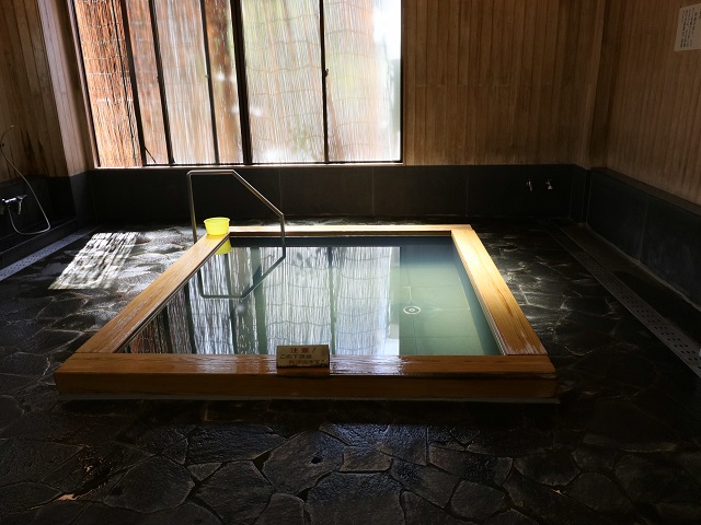 「観水庭こぜにや」は日帰り入浴可能な宿。13時からで料金は1,080円、概ね1時間と言われ、フロントで支払います。貸しタオル付き。名前の通り、池を中心に建物が建っていて、池を回るように造られた通路を通って浴場棟へ向かいます。そこで靴を脱いで男女別の浴場があります。畳敷きの休憩スペースと水のサーバーがあり、利用できます。脱衣所は鍵付きロッカーと棚がありました。内湯「徳足姫の湯」と窓を挟んで露天風呂「もみじ湯」があります。うたせ湯の浴槽はお湯がたまっていませんでした。独自源泉は56℃ですが、流入量をしぼって掛け流しで使用しているそうです。透明な湯ですが、浴槽内は微濁り、微塩味の湯。湯の流れるところは色が変わっていました。露天風呂からの眺めはしつらえた庭ですが、塀の先は幹線道路、少々にぎやかです。温泉棟の向かいには宿泊者専用の貸し切り湯もありました。(鳥取市永楽温泉町651 Tel.0857-23-3311) |