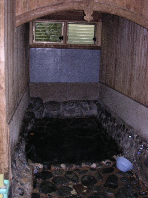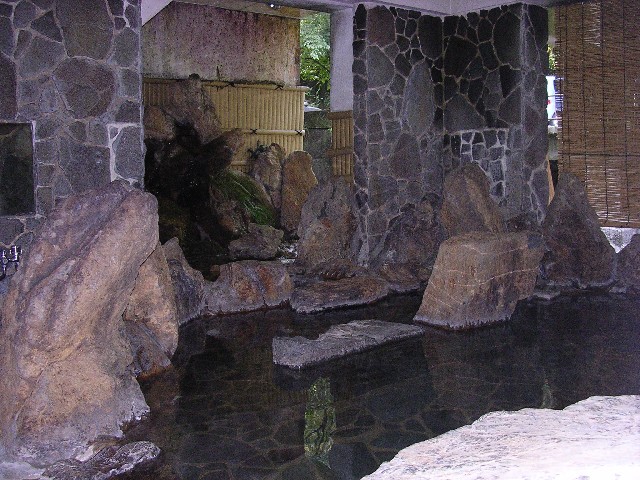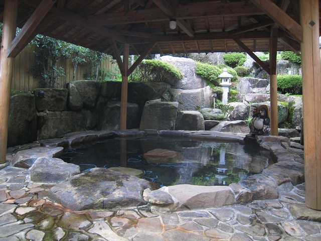三朝温泉「清流荘」は自家源泉を3本持つ宿。日帰り入浴は500円です。内湯は三箇所、露天風呂が男女別にあります。訪れた日は内湯「さくらの湯」が女性風呂でした。ここはタイル張りの浴槽です。男性風呂だった「白狼の湯」は白狼が教えてくれたという伝説の湯で別館にあり、もう一つは巨石を配した「豆狸の湯」(写真)で、地下1階にあります。別館通路から小道を通って向かう露天風呂は岩組みで女性は「ほたるの湯」、男性は「かじかの湯」と名付けられていました。(東伯郡三朝町三朝309-1 Tel.0858-43-0321) |
