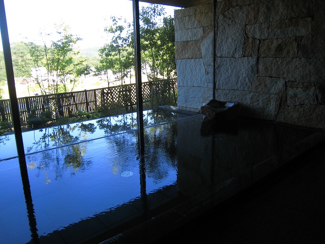 浴場入口に下足ロッカーがあります。脱衣所は鍵付きロッカー完備です。浴室は石造りで、窓に沿って浴槽があります。床より少し高くなっています。サウナあり。露天岩風呂は開放的で、景色が素晴らしいのですが、日あたりがよすぎて早めに退散してしまいました。また、注意書きがありましたが、解放感がありすぎて気になる方もいるかもしれません。お湯は微塩味、透明な湯でした。もう一方の露天風呂はインフィニティ風呂で高濃度炭酸泉があるそうです。浴場前で休憩もできます。