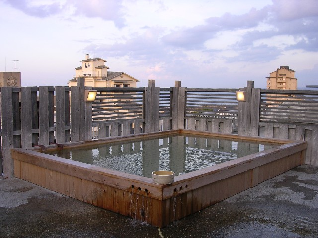 夕凪の湯「御宿野乃」は日帰り入浴が可能な新しくできた宿泊施設です。ドーミーイン系列で、和風。日帰り入浴は6~10時が600円、15~21時が900円です。フロントで支払い、浴室入室用の暗証番号が記入された紙を受け取り、靴を脱いで下足キーをエレベーター前のカウンターでロッカーキーと引き換えます。通路だけでなくエレベーターの中も畳敷きでした。浴場は13階にあり、境港の街並みと日本海を望む窓の広い展望風呂です。サウナ、水風呂と岩組みの露天風呂が併設されています。露天風呂は一部屋根付きで快適、囲いに小さな扉がありのぞくと景色が見えるようになっています。透明なお湯は塩分を含み、よく温まります。施設の外には無料の足湯もあります。駐車場は入浴の場合90分無料になります。(境港市大正町216 Tel.0859-44-5489) |