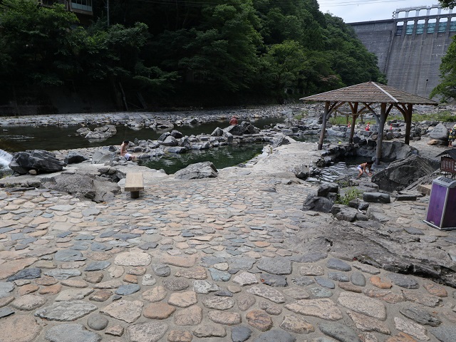 俵山温泉のもう一つの共同浴場「川の湯」。源泉名は河内湯。名前の通り温泉街を流れる正川に面して建っています。料金360円、券売機制。タイル張りの浴槽は二つあり、今は一つしか使っていないようです。奥の浴槽に無色透明な湯が注がれていました。浸かりながら景色が望め、のんびりできました。