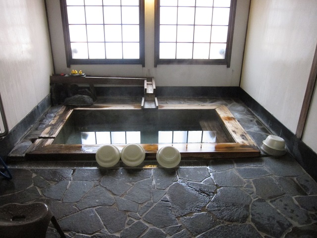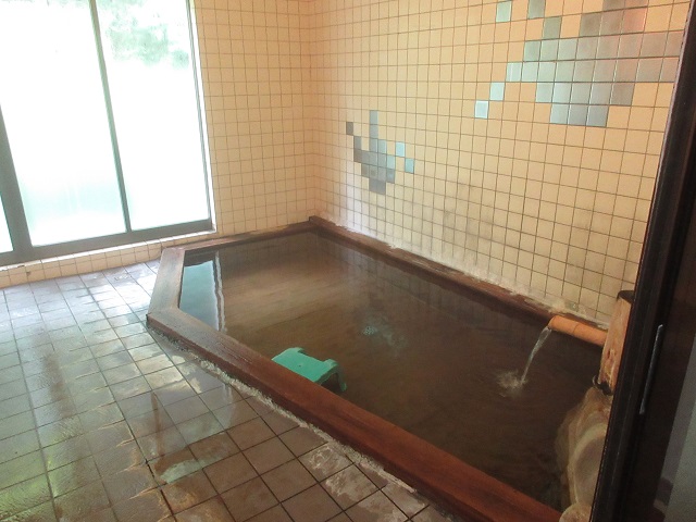 関金温泉「鳥飼旅館」は、日帰り入浴ができ、500円です。階段を上った2階の外廊下の先にある浴場は男女別ですが、利用状況によっては家族風呂として入浴できるようです。訪れた日は手書きの紙と画鋲を渡され、好きな方に入っていいと言われたので、男湯に入りました。タオルが備え付けられていて、脱衣所はシンプルな棚です。檜風呂で深めの浴槽、竹筒から出る湯は掛け流しで適温、気持ちよく入浴させていただきました。窓も大きく、外は緑が茂っています。成分表によると自家源泉で、飲泉もできます。歴史が古く、関金温泉では唯一の旅館となっているので、いつまでも続いてほしいです。