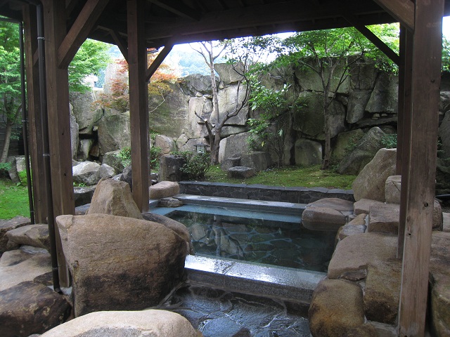 皆生温泉「松涛園」は日帰り入浴1,000円です。一階にある岩組みの大浴場は「銀波の湯」と名付けられていました。もう一方は「金波の湯」です。屋上に木造りの露天風呂「大空海」があります。(米子市皆生温泉4-25-15 Tel.0859-22-3107) |