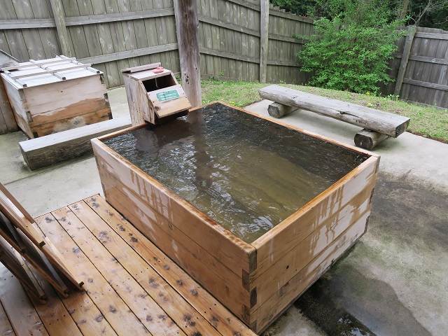 「やまもり温泉」はやまもり温泉キャンプ場内にあります。キャンプの予約がある時間帯は予約なしでも入れることもあるようですが、基本はキャンプ場利用者のための施設です。私たちは少し早い時間をあらかじめ電話でお願いして準備していただきました。日帰りで利用するときも施設使用料が500円、入浴料が500円かかります。チェーンソーアートで作られたおさるさんが温泉の目印。オーナーさんが作られたそうです。一つの建物で二つ浴場が作られていて、利用したのは左の山の湯。入口は施錠できトイレもある脱衣所があり、露天スペースにコンクリートの床の上に木造り浴槽が二つありました。小さい方は古いお湯が入ったままだったので入れませんでした。大きい方の蓋を外すとお湯がなみなみとはってあり、カランから加温された温泉を注ぐこともできます。木のベンチがあり、森に向かって芝の斜面、木の塀が作ってありますが、開放感があり、浸かって見上げる空と森、贅沢な時間です。微硫化水素臭、つるすべ感もありよい湯です。(倉吉市関金町堀 Tel.0858-45-1100) |