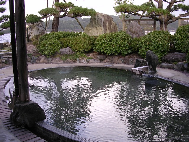 東郷温泉「湖泉閣養生館」は庭が広く東郷湖を望む和風旅館です。大浴場は2階にあり、ガラス張りで湖を望めます。お勧めなのは露天風呂で一旦庭に出て少し歩きます。東屋のある楕円形の浴槽は湖からの風を感じ気持ちよかったです。露天風呂は自家源泉の掛け流しだそうです。無色透明微塩味の湯。日帰り入浴は800円です。(東伯郡湯梨浜町引地144 Tel.0858-32-0111) |