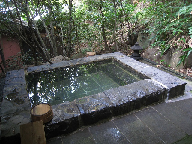 「石山離宮五足のくつ」は天草にある温泉だけでなく空間を楽しむことのできる宿。ヴィッラA、B、Cがあり、すべてコンセプトの異なる離れ形式になっています。それぞれに露天風呂があり、その露天風呂が温泉。今回はOld天草をコンセプトにしたヴィッラAに宿泊したので、温泉は下田温泉でした(ヴィッラCのみ独自源泉だそうです)。いつでも好きな時に入浴できます。宿泊したA−1の露天風呂は石組みでした。このA−1はヴィッラ