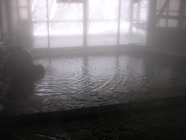 万座温泉「万座高原ホテル(旧:万座高原ロッジ)」の名物石庭露天風呂。脱衣所からつながるところに女性だけのスペースもありますが、閉鎖的。ここでは、さすがに女性は入浴専用の「ゆゆぎ」を着てもいいことになっています。内湯の広くとられた窓からこの石庭露天風呂の全体が見下ろせます。内湯にも併設露天風呂あり。日帰り入浴1,000円。