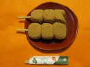- 「かなざわ総本舗」の上杉謙信ゆかりの出陣餅。よもぎ餅にきな粉をまぶしたものに、黒蜜をかけていただく和菓子。類似品に信玄餅があります(爆)