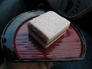 - 「柳澤屋」の玉風味は泡立てた地元産卵の卵白を信州産の寒天で固めたというふんわりとした口どけのお菓子。長方体に切り分けられて、黄味をぬって焼いてあります。この手のお菓子は物足りなさを感じることがあるのですが、まわりの甘みとコクがちょうどよく、食べる前の想像とは違ってかなりおいしかったです。