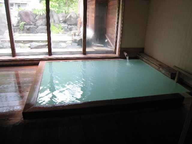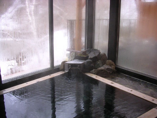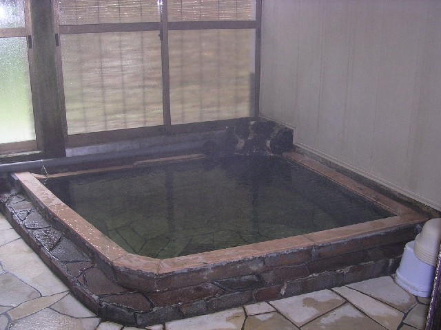 個人所有の温泉。手打ちそばも名物ですが、入浴前に注文しましょう。お湯は一見透明ですが、鉄分を多く含み浴槽や床は赤く変色しています。浴場は広くはありませんが、窓の外に自然を感じられ落ち着きます。深めの浴槽、温めの湯は夏場でも長湯ができました。300円。 |