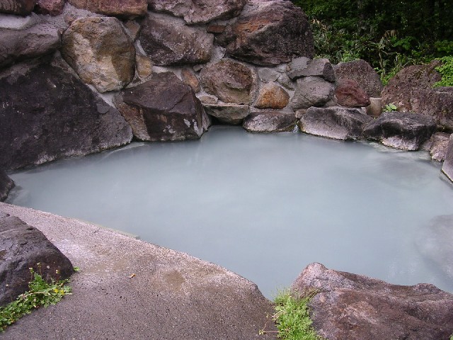 妙高山登山口近くにある岩造りの露天風呂。できた頃は混浴、しばらくの間は脱衣所男女別、一応浴槽も男女別らしく岩と葦簾で区切られているだけでかなり開放的だった黄金の湯ですが、2005年からは完全な男女別になりました。川原の湯より湯温が高く白〜黒っぽい湯花のある湯。「大変滑ります」と脱衣所に書いてありますが、本当に滑るので注意。わざわざ書くということは、私が滑りました。無料。