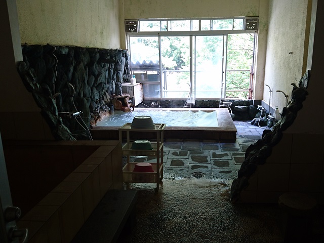 石鎚山温泉「温泉旅館京屋」はロープウェイ乗り場の下にあり、食堂、売店も営業しています。駐車場代が700円+入浴料500円で、食堂で支払いました。脱衣所には鍵付きロッカーがありました。浴室は手前に一つ、奥に一つ浴槽がありましたが、手前はたまっていませんでした。冷鉱泉なので加温のためにブクブクと泡立っています。これがないと結構な析出物が沈殿するようです。底に少したまっていました。白濁の湯は温めの温度設定でつい長湯。相方さんによると同浴の人は手前の浴槽を絶賛していたとのこと。成分表が2枚掲示されていたので、それも気になりました。(西条市西之川甲106 Tel.0897-59-0335) |