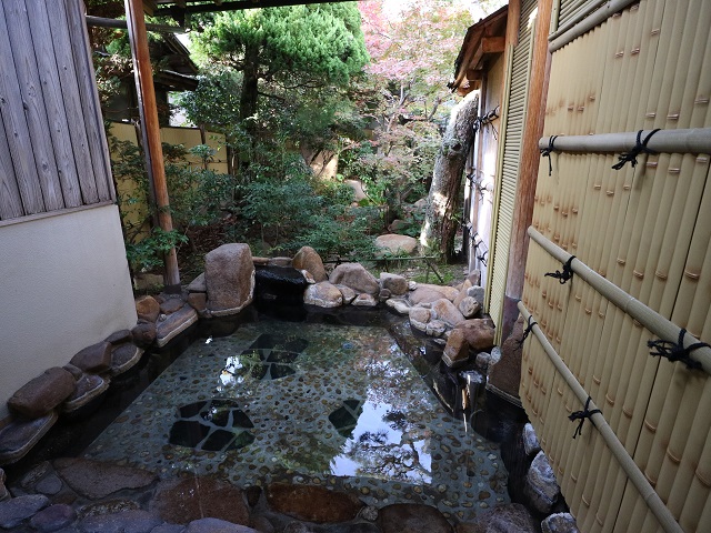 鷺の湯温泉「竹葉」は、足立美術館の隣に建つ宿。基本は食事をした場合に入浴できますが、空いていれば日帰り入浴のみも可能で500円です。レストランの入口を入り受付します。左奥を進み靴を脱いであがったところがロビー、その奥に家族風呂と男女別の浴室があります。脱衣所は棚にカゴが置いてあるだけなので貴重品は預かっていただけます。女湯は、内湯は木造りで、岩造りの露天風呂を併設しています。こじんまりしていますが、熱めの湯が掛け流しです。(安来市古川町467−5 Tel.0854-28-6788) |