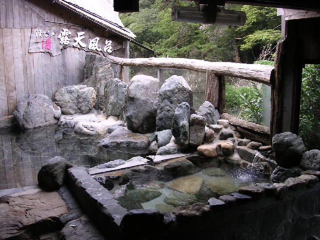 立久恵峡温泉「御所覧場」は景観美を誇る立久恵峡にある宿。日帰り入浴は露天風呂の利用で500円、宿のフロント(2階)か1階にある食堂で払います。お風呂は道を挟んで立つ看板が目印。左が男湯、右が女湯です。浴槽は岩造りで、浅く小さい温めの浴槽と、大きく適温の浴槽の二つに別れています。少しずつ注がれる源泉は川の対岸から湧出しているそうです。景色を眺めながらのんびり浸かるのがお勧め。2018年10月に久しぶりに訪問したら、貸し切り湯ができていました。また浴槽は変わりありませんが露天風呂の脱衣所や洗い場も改装されています。料金も700円になっていました。 (出雲市乙立町立久恵5269 Tel.0853-45-0211) |