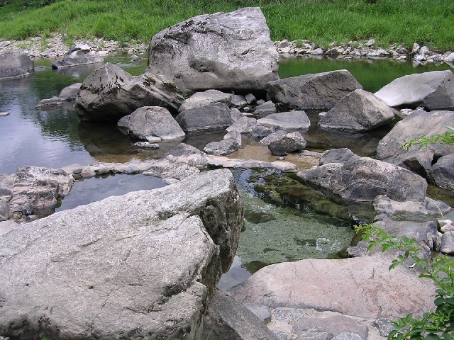 出雲湯村温泉の露天風呂は清流斐伊川の河原に造られた石組みの浴槽。対岸からは丸見えで開放的。もちろん脱衣所なんありません(笑)。石の間から湧く湯は無色透明で心地よく、ギャラリーや迷惑オヤジさえいなければ、もっといいのにな。川が増水したり、発電所が稼動すると沈んでしまう幻の湯でもあります。私は初めて行って入れたのだからかなりラッキー?無料。(雲南市木次町湯村) |