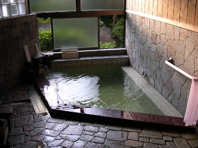 ウェルシティ島根内にある「えんや温泉」。源泉名は有原温泉になっていました。窓際に造られた温泉浴槽は源泉も絶えず注入され、油臭、塩味の深緑色の湯。よくあたたまります。この他気泡浴やジェットバスの浴槽があり洗い場も仕切られていてきれいで快適な施設です。建物内には宿泊施設や食堂、会議室などもあります。日帰り入浴500円。受付で下足箱の鍵を預け、ロッカーキーと引き換えます。*経営変更によりニューウェルシティ島根内の施設になり、料金が変更になっています。 (出雲市塩冶有原町2−16 Tel.0853-23-7388) |