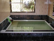 女湯の浴槽です。アメニティはありません。左側から熱いお湯が流れていますが、加水・循環されていると思います。この日は貸し切りでした。周囲は竹林で、窓も広いので、空いていれば開放感もあります。 |