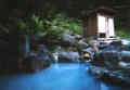 | お風呂は内湯とそれに続く露天があります。内湯は神代檜風呂で檜の香りが一杯に漂っていました。pH10.2の鉱泉が加温循環されています。お湯の個性はあまりないのですが軽くキシキシ?する感じで意外と暖まるお湯でした。 内湯から出ると渓谷を見下ろす位置に岩組みの露天風呂があります。見渡す限り一面の新緑と眼下には日川の清流、少し離れては滝も見え素晴らしい眺めです。緑に囲まれてほんとはずぅーっと入っていたかったのですが人がいないのを見計らって松葉杖でいったのでそこそこに上がってしまいました。その夜は雲っていたのですが、まわりは真っ暗なので晴れていたらさぞかし星も綺麗なのではと思われました。 泉質は昭和2年の分析表では炭酸泉です。内湯のカランから出る湯(部屋の洗面台の湯も)が加温した源泉と思われる肌触りでしたので桶にためて30杯程浴びてみたのですが高アルカリ泉特有のつるつる感が結構でていました。加温掛け流し、もしくはせめて源泉の小浴槽があったらなぁと思うと惜しい気がします。 風呂の入り口の通路に麦茶のはいった保冷ポットが置いてありますがこれもおいしく水の美味さが感じられました。 | ||||||