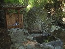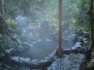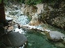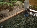 さらに降りていくとメインの露天風呂「藤四郎の湯」があります。ここは昼の2時から18時までが男性専用、18時から21時までが女性専用、21時から翌朝までが男女混浴になっています。この露天風呂はぼくにとっての最高評価の露天と言っても言いと思います。渓流沿いの露天で、川下方向を見ると幽玄な渓谷美が、川上方向を見ると岩に当たって砕け散るダイナミックな波しぶきを間近に見ることができます。何時間いても見飽きない景色です。湯舟は10人ぐらいは入れると思います。上下二段に分かれていて、上の方は湯船に入りながら川の流れを見ることができますが、少し離れた感じは否めません。また、上の方は少し熱めの湯温になっており、自分で調節することはできません。下の段は広くなっていますが、湯舟に入りながら流れを見ることはできません。周りの岩に腰掛けると最高の眺めを堪能することができます。ここには温泉と水がほとんど同量流れ込んでいてぬる目ですが、この水のホースは外の方に外して湯舟に入れないこともでき、また岩の上に置いて、外に流す量と湯船に入れる量を調節することもできます。もともと温泉自体も手ですくえるくらいの湯温なので、水を入れなくても入れる温度ではないかと思います。また、わずかですが、湯の花もありました。と、ここまではいいのですが、残念ながらこの露天風呂の最大の欠点は旅館の部屋や、噴泉橋の上から見えてしまうのです。奥に引っ込んだり、上の段に行けば見えませんが渓流の眺めを堪能したい場合は見られるのを覚悟しなければなりません。また、岩の上にいる場合はタオルでかくせますが、湯舟に入っている場合は、お湯の透明度が高いので、どうしょうもありません。といっても、かなり離れているので、自信がない人でも大丈夫ですが・・・ |