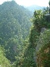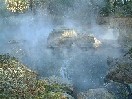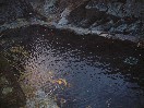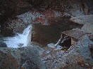 浴衣に着換え、さっそく露天へ行きました。露天へは宿を出て、目の前の国道を横切り、崖に作られた石段を5・6分クネクネと降りていきます。石段は最初の方はまだいいのですが、露天に近づくにつれて急に、しかも一段の高さが高くなるので注意が必要です。特に一段だけかなり幅が狭いところがあります。ここでコケたら石段がとがっていることもあり大怪我は必至です。また、膝を痛めている人や心臓の悪い人、目の悪い人などは避けた方が無難でしょう。なんでも280段あるらしく、60歳までの露天風呂という気がします。谷に下りると、箒川にダイナミックな巨岩がゴロゴロしています。非常にワイルドな景色でこの季節とあいまって荒涼とした感じすらします。ここには、まず一番下に、川とほとんど同じ高さの「河原湯」というコンクリート作りのまるで廃墟のような、まったく情緒のない露天があります。その近くに1.5メートル四方位の正方形の石門湯という湯舟があるのですが、浴槽の底面に石や岩がごろごろしていで危なっかしいし、ここもまた情緒も無いので、一分間の記念入湯のみにしておきました。 |