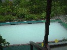 お風呂は一階に男女混浴の露天風呂とその隣に男性用の内湯、さらにその隣には女性用の内湯と女性専用の露天風呂があります。この男女混浴の露天風呂は有名で、大きな長方形の形と深さが1メートルあるということでプールのようなお風呂として知られています。まさにその通りで、何も付け加えることはないのですが、その単純な形から言っても情緒はあまり感じさせません。ここは女性が入るとすると、廊下からお風呂に通じる通路のようなところで着替えなければならないこととか、すぐ近くの部屋や男性用の内湯から覗かれてしまうこととか、入るまでが大変だなと感じました。入ってしまえば、乳白色のお湯なので大丈夫なのですが、旅館も何か女性のために一工夫考えてもいいのではないかと思いました。露天の景色は、万座の空吹きが左の方に見えてはいますが、道路が真ん中を走っているし、目の前に草が生い茂っていて全体的に漫然とした印象です。視界は開けてはいますが、ちょっと絶景という感じではありません。湯船の上に屋根はまったくなく、この日は台風の余波で夕方前まで雨が降り続いていて、ぼくは雨にもかなり強くなりました。湯温は少し熱めでしたが、なぜか翌朝入った時は、この時よりやや温くなっていました。ここは内湯もそうなのですが、ホースが湯船の脇に置いてあり、そのホースから水が出しっぱなしになっています。ですから、ぬる湯好きの人は割と遠慮なくうめてしまいます。とはいえ、もちろんお湯は内湯も露天も源泉流し切りの硫黄泉です。ぼくは夕食前までに計2時間半近く入って、この露天を堪能してきました。この露天に飲泉用のおわんがあることを後で知りましたが、ぼくは計四回入ったのに全然気づきませんでした。内湯にもそれらしきものはなかったので、ここは飲泉できないのかと思っていました。豊国館は源泉は苦湯ということでしたので、是非その苦さを味わってみたかったのに残念です。内湯はそれほど広くはありませんが、四角い湯船で、浴室の床や壁が木で造られていて落ち着きます。いい感じの内湯だと思います。一箇所温水の出る蛇口があり、ここで体を洗うことができます。シャンプー類も備えられていました。露天も内湯も24時間入浴可能です。内湯の脱衣所は床暖房のように温かくなっています。この下にお湯を貯めているのかも知れません。 |