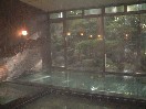 大浴場には大きな温泉成分表が張ってあり、これは温泉にまちがいないと思いますが、ここにも謎が、湯面が非常に静かなのです。湯面より上からの流し込みがまったくなく、湯の中からの流し込みだと思われますが、それにしては湯面がおとなしすぎて、どこから入れているのか良く分かりません。初めは、普通の家庭のお風呂のように、その日の分を入れてそれっきりかと思いましたが、湯船の中を一周してお湯の流れ込んでいる口を発見し、やれやれと安心しました。お湯も汚れてはおらず、湯船は旅館の規模にしてはわりと広めでしょうか。この内湯は塩素臭は感じませんでしたが、成分分析表によると源泉の泉温は34度ですので、沸かしています。浴場内はわりと暗めですが、そんなにいやな感じはしません。ここには露天は併設されていない訳ですが、大きなガラス窓の向こうには、人工的に造られた庭のダイナミックな造型が見えます。といっても、大きく広がる庭ではなくて、ほんの坪庭で見晴らしは全く無いのですが、そのロケーションを逆手に取っているという感じでしょうか。ここは部屋数もそれほど多くはないのですが、やはり宿泊客の目的は温泉ではなく、東照宮などの観光にあるらしく、露天も大浴場もほとんど他の人には会いませんでした。