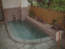 | お風呂は、昼間の掃除の時間を除いて、24時間OKということでした。男女交代もありません。大浴場は窓は大きく取られているものの、地形の関係で光があまり入らないため、全体的に暗めですが、そんなに悪い印象ではありません。小ぢんまり落ち着いた感じの内湯で、6人ぐらいは入れるでしょうか。オレンジ系ソープ・シャンプーと、炭系のものとが交互に置かれていました。 露天は大浴場から出る形です。湯舟が二段になっていて、上はやや熱め、下は温めで、確か冬期は上段にお入りくださいというような立て札があった気がします。といっても、下段も入れない温度ではありません。ゆっくりしたい人にはよさそうです。露天の敷地全体は、割と狭いのですが、敷地を最大限、湯舟として利用しているので、けっこうな人数が入れそうです。周りを囲まれていて見晴らしはなく、後ろの小高いところに竹林があって、見下ろされている感じがします。内湯は湯舟からお湯があふれ、流しきりと思われますが、分析表によると、一部循環と書いてあるので、これは多分お湯の出の激しかった露天の方がそうだったのかもしれないと思われます。ただし、露天は塩素臭はほとんどしなかったと思いますが、なんとなくするような瞬間がなくはなかったという微妙なところです。お湯は湯の花はなく、なめてみると甘味があっておいしい味でした。 |