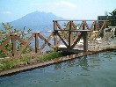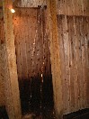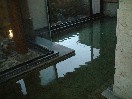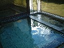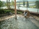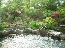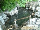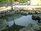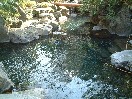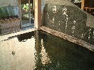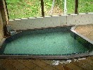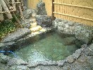 さっそく源泉の露天へと出かけました。このお湯は月の湯と名づけられ、多分後から作られたものだと思います。もともとのお風呂は一階に男女別にそれぞれ露天もついてあるのですが、こちらは加水で循環のようです。ただし、塩素臭はしません。さて、その月の湯ですが、四・五人ほど入れる浴槽の端から源泉が注がれています。もちろん流し切りです。あとで旅館の人が温度計を持って計りにきたのですが、湯口から一番遠い対角線のところで44度、近くの端のところで47度。湯口のところで77度(?)だったようです。表面が熱いから湯もみして入るようにという書つけがあり湯もみ板が置いてありましたので、初めて湯もみしてみましたが、あれはなかなかうまくいかないですね。草津の熱の湯の湯もみショーみたいにはいかないもんだなぁと思いました。湯口には檜の枡が置いてあり飲泉できるようになっていましたが、このお湯もしばらく置いておかないと熱くて飲めません。冷まして飲んだところ、しょっぱーい!!という感じで、いままで飲んだ中でのしょっぱさ最高峰という気がします。また、この松之山は日本三大薬湯であるらしく、確かに何かの薬草を煎じたような味がします。それに檜の枡のにおいが加わって何とも複雑な味とにおいになっていました。他の人はアブラ臭いと言っていましたが、ぼくは檜の匂いかと思っていました。とにかく、しょっぱすぎて、枡一杯飲んだら絶対に体に悪いなと思っていたら、案の定、飲泉の際は三倍に薄めて飲むようにという但し書きがありました。しかしさすがにこれだけの塩分ですから、あったまることは最高ですね。ただ、残念なことにここは山に近いということで、ブヨが多く、やたらに噛み付いてきます。アブほどは強烈ではないものの、あまりいい感じはしません。また、夏になると露天の柱にたくさんのヤママユ蛾が張り付いているとの常連さんからの情報もありました。とにかく、ぼくはこの熱い湯に出たり入ったりしながら、結構長い時間入っていました。見晴らしはまあ利くものの、町中ですので大自然の中と言う感じではありません。大浴場も循環しているとはいえ、結構熱くなっています。塩素臭はしませんので、かなり流し切りに近いのではないでしょうか。小ぢんまりした浴槽ですが、旅館の規模には合っているとおもいます。また、併設された露天も二三人が限度という小ささで、見晴らしもまったくありませんが、すぐそばに魚の泳ぐ生簀のようなものがあり、面白いと思いました。ただ、部屋に冷水があるとはいえ、湯上がりどころにも冷水がほしい気がしました。 |