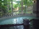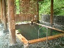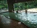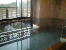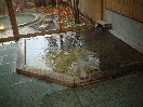 さて、大浴場ですが24時間OKで男女交代はありません。男性は岩風呂になっていてワイルドな感じです。洗い場は五つくらいしかありませんが、まあ旅館の規模から言ったらこんなもんでしょう。浴槽は五、六人が入れる程度でやはりこんなもんかなという感じです。新館だけあって新しく、湯屋作りになっていて快適です。ただ、湯温は熱めで、確か、湯面へのお湯の流れ込みがなかったので味を確かめることができませんでした。ただし、源泉流し切りだとは思われます。水温計が浮かんでいて、見たら44度になっていました。露天は大浴場から出るタイプで、2,3人程度しか入れないほんの小さなものです。ほんのおしるし露天と言っていと思いますが、目の前に木が3本くらい植えられていますので、極端に狭いという感じはしません。ただ、周囲を囲われていることは確かです。 |