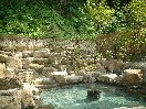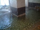 風呂は深夜の1時〜3時が休みでその間に男女が交代します。大浴場は男女とも同じような作りで、横に細長く波型のカーブを描いています。露天は当日の男性用は岩風呂が上下に二つあり、上の方から下へとお湯が流れ込む形になっています。ただし、下の岩風呂のメインは浴槽の中から湧き出すお湯です。この二つの岩風呂のお湯には茶色ぽい細かな湯の花が浮いていました。土湯温泉は全体的に湯量は豊富なのではないでしょうか。この岩風呂の外に、使われずに余ったお湯が惜しみなくパイプから流れ出ていました。ということで、この二つの岩風呂は完全に流し切りだと思います。ただ、加水していることも確かです。旅館の従業員が栓をひねって温度調節をしていました。 |