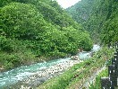 さて、一時間以上前ですが、さっそく部屋に案内してくれました。3階建ての3階の「栃」という部屋でした。ドアを入ると踏み込みの右手に洗面所があり隣がトイレになっています。このトイレは洋式ですが温座ではなく、座るとひやっとします。トイレの位置は違うものの昨日の千歳と似たつくりです。正面のふすまを開け、十畳の主室にはいります。左手全面が床の間、正面に広めの広縁があります。窓からは前の建物が左手に、右手には清津川の流れが眺められます。また斜面は緑におおわれています。床の間には立派な花が活けられていました。案内係の人もいてお茶も出してくれ、ゆかたのサイズの気づかいもあるなど、秘湯の宿の割にはいい待遇でした。床の間も立派なもので、左右に仕切られ、テレビやインターフォンが置いてあるところとメインの床の間とが区別されていました。天井も高く取られ、かなりしっかりした作りだと感じました。ドアはオートロックで秘湯の宿には珍しいと思います。ただ、オートロックはホテルのようにカードキーが何枚もあるときはいいと思うのですが、不便なことも多いのであまり好きではありません。 |