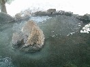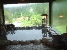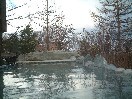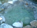 さて、さっそく露天に行きました。宿の玄関を出て少し下がったところに、小さな湯舟が二つと脱衣所、さらに五段くらい下がったところに、屋根つきの広い露天と脱衣所がありますが、もちろんこの上下の露天を行き来するのは、着替える必要はありません。これらの露天はすべて女性専用の夜7時〜8時以外は混浴です。こう書くと、食事時間と完全にバッティングすると思われるでしょうが、食事は5時15分ころから始まって、量も少ないので、まったく大丈夫です。まずぼくは、広い露天でくつろぎました。雪をかぶった遠くの山をはさむ形で近くの山が迫ります。ちょっと電線が目立つのが雰囲気を壊していますが、なかなかの景色だと思いました。また、屋根がありますので、雨の時でも気にせずに入っていられます。ここは7・8人ぐらいの大きさでしょうか。真ん中に大きな岩がありますので、混浴でも人さえ少なければ相手の死角に入ることができます。場所によって違うとは思いますが、一番前のところはやや温めでした。けっこう湯の花があって、それが底に積もるのか、かなり底がぬるぬるします。すべらないようにゆっくり歩きました。上の二つの湯舟は、一つは木のくりぬき風呂(根っこ風呂)、もう一つは小さめの畳くらいの大きさがある浅めの浴槽で、寝湯に近い形で体を伸ばせます。こちらは屋根がありませんので、満天の星空を眺めるのには絶好です。ぼくは夜、露天に入れなかったので星空は眺められませんでした。内湯は非常に雰囲気のあるものだと、ぼくは感じました。四角い木の浴槽で、床から40センチくらい立ち上げてあります。浴室は湯屋造りでそこそこ高さもあると思います。ただ、それほど広くないので、せいぜい4人くらいでしょうか。またお湯はやや熱めです。お湯の流れ込む脇に水道もあり、そこから少し水が流れていました。壁にはコップが備え付けられており、飲泉ができます。特にこれといった印象は残っていませんが、飲みやすいものでした。ただ、この内湯には洗い場というものが全くなく、体を洗いたい人にはかなり不満が残るでしょう。一応シャンプーとボディソープはあるのですが使いにくいと思います。 |