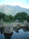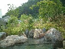 さっそく、お風呂へ向かいます。最近できたらしい山の湯というのは広く、たくさんの浴槽があるのですが、一か所しかないので男女交代になります。男性は昼から夜の8時までで、それ以外の時間はすべて女性です。この宿は女性優位の宿であることを謳っているらしく、アメニティの足袋も女性だけ、デザートのぜんざいも女性だけのサービスで、たしかにこの日も女性の団体客が多かったようです。もともと男女別にあった大浴場とそれに続く露天も交代制で、二つのうちゆったりとした風情のある露天の方が夜まで女性用、男性は朝だけでした。山の湯は、広めの内湯と小さめの露天がたくさん並ぶというつくりになっていますが、浴場に入るなりかすかな塩素臭がします。これだけたくさんの浴槽を作ったのですから、循環は当然かもしれません。お湯をなめてみても、ほとんど特徴のないお湯という感じでした。確か塩化物泉ということですが、塩味はしません。ややぬる目の適温でしょうか。ここは内湯の仕切りがほとんどガラス戸になっていて、昼間はそのガラス戸がすべて開放されて、半露天の感じになっています。明るく開放感があり、内湯で十分満足できました。もともと小さい湯船は好きではないので、その他の湯舟は一応一回ずつ入ったきりでした。小さい湯船の一つに、温泉に真珠の粉を入れたという「真珠風呂」なるものがあって、白濁しています。ここは女性には人気の浴槽のようです。この山の湯の湯上がりどころにはお茶と冷水が置いてあり、小梅と小さなきゅうりのつけものも食べることができます。このきゅうりはおいしいものでした。もともとあった大浴場と露天もなかなか感じが良く、緑や山々の見晴らしもあってこれだけでも十分満足できるものです。 |