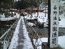 越後長野温泉「嵐渓荘」へ行ってきました。嵐渓荘へは新幹線の燕三条駅から一日一便送迎のバスが出ており、50分ぐらいで宿に到着します。この時期にわざわざ新潟まで行ったのですから、何と言っても目的は雪見の露天風呂です。送迎バスが30分ぐらい走ってから雪国らしい景色になり、宿近くになると、道路に沿った川にたくさんの白鳥を見ることも出来ました。宿の周辺は願いどおりすっかり雪景色で、足下に気を取られてこの時は気がつきませんでしたが、翌日見ると、玄関のある建物は木造の三階建てでなかなか風格を感じさせる立派なものでした。この日は日曜のせいか、立ち寄り客なども多いらしく、また、送迎バスから一度に客が到着したせいもあってか、ひっそりした秘湯という感じではありません。到着したのは3時少し過ぎで、一応チェックインは4時なのですが、部屋の用意ができていれば2時から入れるそうです。食事の時間などの簡単な打ち合わせの後、すぐに部屋係りの女性が部屋へ案内してくれました。嵐渓荘には一番新しい鉄筋の「渓流館」、もと燕駅前にあった料亭を移築したという「緑風館」、そして少し離れたところにある木造の「りんどう」という三種類の建物があり、この順に料金にも差がつけられています。また、料理は大雑把に言うと「フルコース」と「控えめコース」の二種類があり、基本的にはこの組み合わせで料金が決まるようです。ぼくは、一人旅であり食いしん坊なので「りんどう」の「フルコース」で申し込みました。「りんどう」にはトイレも付いていて、へなちょこのぼくでも安心です。その、りんどうへと案内してもらったのですが、途中、緑風館の大広間ではまさに、カラオケ大会の宴たけなわという感じで、歌声が廊下に響いていました。さっきの玄関の様子といい、いや〜繁盛してるなという印象でした。地元に愛される旅館ということは素晴らしいのですが、わざわざ遠くから秘湯の宿を求めてきたお客さんは少々がっかりするかもしれません。ただ、これはこの日が日曜であったせいらしく、翌日の月曜はうって変わってひっそりとしたものでした。この違いも大変なものでした。 |