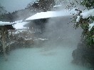 連泊ですのであせる必要はありません。ちょっとくつろいでからお風呂に向かいます。まず行くのは何といっても混浴の露天でしょう。事務所側の宿の建物を出ると、小川を挟んで向かいにお風呂が並んでいます。小さな橋を渡った正面に白湯と黒湯。右の小道を行くと混浴の露天と中の湯。左に行くと女性専用の露天になります。露天以外はそれぞれ男女別の湯船がありますが、いずれも二人程度の狭いものです。ただ男性用の白湯はいくらか広いものでした。混浴の露天は小道に面していて、真ん中あたりに屋根だけがかかった脱衣棚がありますが、狭いもので、この時期は雪がつもっています。男女とも中の湯の脱衣所から出られるようになっていて、みんなここから出入りしていました。この混浴の露天は外から見ると思ったより狭い感じがしますが、入ってみると意外に広く何人でも入れそうです。朝食の食事会場に、この露天にたくさんの人が入っているポスターが張ってありましたが、正確に数えた訳ではありませんが、百人くらいは入っていたのではないでしょうか。この露天は見た瞬間にわーっと叫ぶような新奇性はありませんが、じっくりつかっていると、その良さをじわじわと感じるような露天です。白湯の建物近くから樋でお湯が流し込まれ、湯船に二つ見えている岩の下あたりからもぶくぶくと泡が立っています。また、樋でお湯が流し込まれるあたりの下からも熱めのお湯が力強く湧き出しています。小道に面した方の反対側はなだらかな斜面で雪が積もっていますが、まだ真っ白ではなく濃淡があるところが、かえって奥行きを感じさせます。まさに温泉情緒に溢れた露天です。今回はとにかくお客さんが少ない時期ということで選んだので、多分ぼくが入ったときで一番多くても10人ちょっとしかいなかったのではないでしょうか。そのせいもあって、本当にこの温泉情緒に十分ひたれることができました。連泊で合計10時間くらいこのお風呂に入ったと思うのですが、そのうち独占して一人で入れた時間が2時間近くあったかもしれません。昼間も夜もいいとは思うのですが、やはり夜が明けかかるときの薄墨色の世界がこの鶴の湯の露天には一番似合いそうです。お湯は注がれている部分から一番離れる中の湯の入口辺りはややぬるめですが、でもぬるすぎるということはありません。ここにずっといても十分温まると思います。もっと熱いのがいいなら注ぎ口に近づけば熱めになります。泉質に関しては弱酸性ということで、一日目は本当に柔らかなお湯という感じがしたのですが、二日目の夜はまるで蔵王のお湯のように目に染みてかなり目が痛くなりました。ところが三日目の朝になるとまたもとのお湯にもどったような感じになり何ともなくなりました。これはちょっと不思議でした。露天に入り浸りになっていたので、他のお風呂は駆け足になってしまいましたが、湯船はみな小さいものの、それぞれ力に溢れたお湯だと思います。男性は白湯と黒湯の脱衣所は同じなのですが、この脱衣所や湯船も雰囲気のあるものでした。これらの外のお風呂とは別に立ち寄り客は入れない内湯があるのですが、ここにはシャワーが一つだけついています。ただ、湯船はやはり小さめで、明るすぎたせいか雰囲気はあまり感じられませんでした。小さな家族風呂という感じがしました。 |