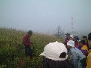 長野の美ヶ原 に行って来ました。初日は、美ヶ原高原の「王ヶ頭ホテル」で温泉ではありません。温泉旅館のようなサービスを期待するとがっかりしますが、お風呂もきれいだし、食事も量は少ないですがおいしいです。何よりもすばらしい景色と、可憐な高山植物がいいと思います。今は、「まつむし草」という花が盛りのようでした。それよりも、名物(?多分)なのはここのおやじさんで、そのガイドぶり(写真)は抱腹絶倒ものです。心をなごませてくれること請け合いです。あまり天気がよくなくてせっかくの景色も十分には堪能できませんでしたが、昨日の朝は「王ヶ鼻」というところでブロッケン現象を見ることができました。まさか、そんな経験ができるとは思っていなかったので感激しました。 |