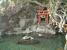 さっそく、龍神露天風呂に出かけました。露天に入るにはまず、風呂専用のフロントに行き、そこでキーを預け入浴用の「南無観世音大菩薩」という言葉が背中に大書された白い浴衣(よくい)を受け取る仕組みです。この浴衣は別料金で210円しますが、宿泊者は一回払えば、後は何回入っても浴衣代は一回分で済みます。大浴場に入る場合でもこの風呂専用のフロントでキーを預かってもらえ、これはなかなかよいシステムではないでしょうか。部屋の金庫のキーがないことと合わせて、キーの安全に関してはなかなか留意している感じです。龍神露天風呂に関しては、浴衣を着て入浴しなければならないということに抵抗がある人ももちろんいるでしょうが、入ってしまえば意外に気にならないものだと感じました。むしろ、カップルも他の人に遠慮せずにゆっくり入れるという意味で、これはなかなかのアイディアかもしれないという気がします。普段は混浴で女性と話をするなんてことは考えられませんが、ここではみな同じ格好なので遠慮なく話もできます。ここは、もちろん錦江湾の海の眺めも素晴らしい上に、海に飛び込もうと思えば飛び込める近さ(もちろん飛び込み禁止です。もし飛び込んでも後は知りません)です。また、海を背にして反対側を向いても、たくさんの観音様を祀った祠?、男岩、あこうの木のからみあった根、小さな洞穴の中の飲泉、あこうの木に留まる様々な小鳥など、目に映る珍しいものも多いので長くいても退屈しません。お湯も食塩泉なので、少しぐらい湯舟から体を出していてもすぐに寒くなると言うことはありません。ただ、濡れた浴衣でまたお湯の中に体を入れるときが結構冷たく感じますが、それくらいです。この龍神露天風呂には、結局、昼・夜・朝と一時間ずつ三回も入ってしまいました。ただ、おどろおどろしくからみあったあこうの木の根や、観音様がたくさん祀られていることもあり、夜一人で入ると怖いかもしれません。本当は夕方の、日の沈むところも露天の中から見たかったのです。しかし、この日も夕方に大量の噴煙があがり、初めは風向きが違ったので良かったのですが、そのうちに風向きが変わり、湯舟にも灰が落ちてきて、果たせなくなってしまいました。この日は灰が降ってきたため、一度入浴禁止にして灰のやむのを待ち、急いで湯舟を清掃して、結局、夜の8時半から再開したそうです。お湯を抜くのに30分、入れるのに2時間半ぐらいかかるそうです。露天風呂まで本館からかなり下って行くのですが、斜行エレベーターが備えられて以前より大分楽になったようです。また、露天の小さな洞穴の奥には飲泉用の柄杓がおいてあるので、この露天は源泉流し切りだと思うのですが・・湯の花のたぐいはありません。 |