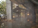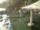 ぼくが新明館へ行きたいと思ったのはこの洞窟のお風呂ではなく、もう一つの露天、岩戸風呂が目的でした。大体、このお風呂を紹介してあるものには神秘的な雰囲気とあり、どんな感じなのか、是非確かめてみたいと思っていたのです。岩戸風呂は洞窟風呂や穴風呂の先、川に沿った一番奥に位置していて、混浴です。入口にトウモロコシのぶら下がった脱衣所を開け、着替えて湯船に出ると、えっ??? ガーン!!! って言う感じです。あの本や雑誌て見慣れたはずの岩戸風呂が、何と高速道路下に引越しでもしたかのように、コンクリートの太い支柱に囲まれています。あの神秘的な雰囲気はまったく吹っ飛んでしまっています。チェックアウト後にフロントの女性に聞いたのですが、上の方から石などが落ちてきて危険だということで、今年の4月頃に工事をしたということでした。ああ、4月前に来たかったという気がしました。確かに、コンクリートを消して想像すると、薄暗い岩の壁を背景に、古い屋根がかかった小さなあずまや風のものが二つ湯船に立っている姿は神秘的な印象を与えます。ただし、左側の対岸には旅館街があり、左は細い木々で目隠しをしていて、決して山の中などではないのですが、写真は必ずその部分を外して撮っているようです。ただ、コンクリートが印象を悪くしてしまったとはいえ、元の岩戸風呂の雰囲気はもちろんたくさん残っていて、ゆっくりできる露天であることは確かです。湯温はやや熱めで、奥の壁から熱いお湯が流れ出ています。もちろん、お湯は流し切りです。