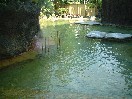 ここの露天風呂は「鬼のすみか」と名付けられた混浴のもので、もちろん天降川の岸辺にあります。さっそく行ってみると川岸から見上げる杉木立の壁の高さは思ったほどではなく、意外に明るくて、怖いくらいの雰囲気というものはありませんでした。杉木立の連なりがこの倍くらいの高さがないと、そんな感じにはならないのかなと思いました。湯舟は上下二つあり、上の露天も広々として景色もよく、これだけでも十分と言えるような露天ですが、残念ながら川面は見えません。 |