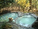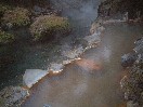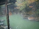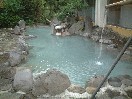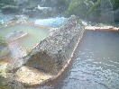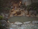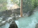 この黒川荘には混浴のお風呂はなく、すべて当日と翌日の入れ替え制です。当日は夜中の12時までで、翌日は朝の6時からになります。お風呂は、内湯が二つと内湯から出る形の露天がそれぞれ二つずつあります。びょうぶ岩露天風呂と名付けられた、当日男性用の露天の一つはかなり大きなもので、しかもけっこう深いところがあります。一番長い部分の直線距離は20メートルくらいはあるのではないでしょうか。この広い露天に、グリーン系の濁ったお湯がたたえられています。周りを囲まれていますが、このようにかなり広いので圧迫感はまったくありません。びょうぶ岩露天風呂という名の通り、近くにまっすぐにそそり立つ、紅葉した木で彩られたびょうぶ岩があり、それをお風呂の中から眺めることができます。この露天は一番奥の岩の高いところからお湯が流れ出ていて、そのままでは熱すぎて手にとることが出来ません。また、ここには柄杓はなかったので、飲泉は不可なのかもしれません。四角い打たせ湯の露天はお湯の量と強さがちょうどよく、最近まったく打たせ湯に当たらなくなったぼくも、いい気持ちで当たってきました。内湯は少し暗いのが欠点ですが、湯船も浴場も広くてゆっくりできます。特に、洗い場と湯船との間がかなり広く取られています。もちろん源泉流し切りのお湯です。シャンプーやリンスはよもぎを使ったもので、どうやらこれは自然への影響を配慮した、黒川統一のもののようです。お湯は内湯、露天ともやや熱めかもしれません。翌日男性の露天は、やはり二つありますが、大きさはそれほどではありません。ただ、それは前日の露天に比べての話で、一般的には十分な広さです。奥の観音露天風呂と名付けられた露天は、朝でもやや暗めで一人でゆっくり出来ました。流しきりのお湯が、内逃がしの管に流れ込んでいくのをしばらく湯船の中で眺めていました。この二つの湯船もやはり、それぞれびょうぶ岩を眺めることができました。ただ、湯めぐりの人が多い関係でしょうか、湯上がりの冷水などを飲むところが特に設けられていないのが残念です。また、男性風呂はそうでもなかったのですが、女性の方のお風呂は湯めぐりの人たちでかなり混雑していたようです。 |