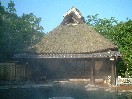 | 離れ形式の宿ですので、お風呂はすべて部屋を出て外を歩いて行かなければなりません。昨日が夏休み最後の日で昨日まではにぎわっていたようですが、その反動で今日はわれわれ一組しか宿泊していないそうです。ただ、立ち寄りが夜の7時半まであるので、それ以降だったらすべてのお風呂に自由に入っていいということでした。男女交替はなく、内湯は24時間OKです。ただ、露天は男性が11時、女性は10時までだそうです。女性の露天は一番奥にあり、池の周りを少し歩かなければならないので、夜は早いそうです。 まず日の高いうちに露天に入ろうということで、露天に向かいました。風呂は部屋よりも敷地の奥のほうに女性の内湯、男性の内湯、男性の露天と固まってあり、さらに奥に少し歩いて女性の露天が位置しています。 露天のサイズは男女とも同じくらいの石造りの長方形のもので、4人程度の大きさでした。両方とも浴槽の周りに、ぐるりとある程度のスペースが取られていて、周りや天上を木々の枝葉が取り囲んでいます。男性の露天は池も見え、池にいる大きなアヒルや、枝に止まった、美しい小鳥を眺めながらゆっくり入浴できたのですが、後で女房に女性の露天の感想を聞いたところ、浴衣を脱いで、湯船に浸かったとたん、とてつもなく大きなカエル(女房によるとウシガエルということだが、疑問)が出てきて、のそりのそりと脱衣所に入っていったので、どうしようかと思ったが、何とか裸の上に浴衣だけを着けて、ほうほうの体で内湯へと脱出してきたそうです。もう二度と露天には行かないということでした。確かに池に面しているし、言われてみれば、男女とも露天の湯口にカエルの石像があるのです。かなりカエルは出てくるのではないかという気がします。ぼくはカエルは別に構わないのですが、カエルがたくさんいるということは必然的にそれを狙う蛇も多いということで、ちょっと嫌な気分になりましたが、幸いに僕が入っていたときには何も出てきませんでした。翌朝、一人で女性用の露天に入ってみましたが、池は見えないものの、自然に囲まれた悪くない露天でした。 内湯はいかにも秘湯の宿という感じの、しゃれっ気の全くないところですが、不潔ではありません。池に面して大きくガラス窓がとられ、明るい印象です。ただ、透明な窓ガラスがかなり曇りガラスに近い感じになっているのは、それが秘湯の雰囲気をかもし出していると言えば言えるのですが、やはりちゃんと磨き上げて欲しい気がします。そのガラス窓沿いに端から端まで石造りの長方形の湯船になっていて、7人くらいは入れそうです。洗い場は4つあり、蛇口のお湯は温泉が出てきますが、シャンプーの類はありませんし、シャワーもありません。 お湯は透き通った薄い黒で、東京などにも黒いお湯が多いようですが、実は黒いお湯に入ったのはこれが初めてだったと思います。ただ、露天は無色です。確か、露天が旅館の源泉のみで、内湯は温泉組合のものを混ぜているという話でした。両方とも硫黄泉で、ぬるすべタイプです。飲泉用のひしゃくが内湯にも露天にも置いてありましたが、飲みやすくて非常にいいお湯だと思いました。硫黄泉は酸っぱかったり、苦かったり、渋かったりととかくクセのあるものが多いのですが、ここはまったくクセがなく、それどころか非常においしい硫黄泉です。若女将もお湯だけは自慢だと言っていました。 |