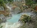 | 二日目は鉄輪温泉の「おにやまホテル」です。鉄輪に行くなら絶対にここと前から決めていた宿です。部屋は東館の四階でした。10畳で広縁も付いていますが、床の間が非常に狭いと思います。新しさは感じさせないが、古くもありません。部屋のキーは温泉旅館にはめずらしく、オートロック方式でした。部屋の眺めは海方向で、少し町を見下ろす感じです。湯煙がたくさん立ち上っているのが見えました。さすが、別府だと思いました。部屋にお風呂はなく、シャワー設備だけがあって、めずらしいと思いました。風呂は円く細長い形の大浴場の先に露天がついているという形式のものでした。露天は、確かどこかに広さが西日本一とか書いてあった気がしますが、確かに広いです(写真2)。開放的でどこか南国の匂いを感じさせる露天でした。ぼくは結構気に入ったのですが、この露天の最大の欠点は背中にホテルの建物をしょっていて、各部屋からのぞかれ放題という点ですね。夜の10時に男女交代するのですが、これでは女性は交代する意味がありません、部屋からの死角となるところにかたまるしかないような気がします。と言っても、あまり気にしない女性もいて、朝、部屋から見える場所にも3人ぐらい入っていました(ということは、覗いたのか)。昼の女性風呂に当たる露天はあまり覗かれる心配はないのですが、男性用に比べて狭くすこし暗い感じがします。しかし、こちら側には「滝湯」という露天がついていて、この露天はちょっとイケます(写真3)。この露天へは、女性の露天の先から幅1メートルほどの小道を何と3メートルほど下っていくのです。ちょっと、秘密の花園めいた露天です。周りをすっかり囲まれた、何か異空間にまぎれこんだ感じで、夜中はここは男性の時間帯ですが、夜中に行くとちょっとゾクっとしますよ。ここはお湯の温度も低めです。滝湯の名の通り打たせ湯が四本、高いところから流れ落ちています。どのお風呂も源泉流し切りですが、温度が高すぎて湯口が鉄柵で囲われており、手ですくって飲むことができないんです。お湯に入っている時には硫黄のにおいはそれほど感じないのですが、あとでにおいが下着についていました。食事に関しては期待していなかったのですが、城下カレイ、関鯵、ステーキ、揚げ物など、おいしいと思いました。ただ、ほとんど初めから並べられてしまう形式で、ごはんまで初めから出してありました。一応、揚げ物とおすましが後出しなんですが、始めてから15分ぐらいして持ってきたのには笑ってしまいました。朝食はバイキングです。品数はそんなに極端には少なくはない感じですが、牛乳、コーヒー、果物はありませんでした。味はごく一般的で、まずくはありませんが、特にこれといったものもありません。 |