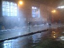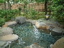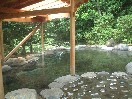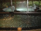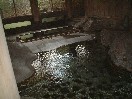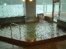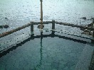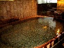 ここのお湯は飲泉可能で、非常に甘い感じがします。今までぼくが味見をした温泉の中では、純粋なおいしさで言えばNO1でしょう。ということは、非常にクセがないということでもあり、クセのあるお湯が好きな人には多分物足りないお湯ではないかと思います。この旅館は料理にはすべて温泉を使い、冷水もこのお湯を冷やしているということでした。冷やしたものも非常においしく感じました。大浴場には固形せっけんだけしかありません。リンスインシャンプーがタオルとともについていますが、このへんは旅館の大浴場というよりも、立ち寄り湯の雰囲気ではないでしょうか。脱衣所にも洗面台がなく、ヘアトニックなども何もありません。露天は、大浴場の湯舟を通って外へ出る方式です。しかし、小さな庭いっぱいに作られたという、四角くて何の情緒もない感じの露天で、底の石がざらざらしています。下手に歩くとすりむいてしまいそうであまり長く居る気がしません。周りを塀と高く刈り込まれた植え込みにはさまれて、長方形の空が見えるだけです。 |
