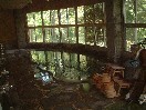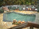 | 二日目は修善寺から西伊豆の松崎方面へ向かう途中にある船原温泉の「山あいの宿 うえだ」です。ここは秘湯を守る会の宿です。山あいの宿、また秘湯の宿に入っていますがそんなに奥深いところにあるわけではありません。松崎へ向かう道路のバス停で降り、二三分歩くに過ぎません。坂を降り、小川にかけられた小さな橋を渡ると、和風の玄関が見えてきます。着いたのは一時半頃で、玄関は暗く館内はひっそりと静まり返っていて、相当前に着いてしまったかと思ったのですが、ここはインが二時で、着いたのは30分前に過ぎませんでした。宿の人はどうも一人しかいない感じでしたが、さっそく部屋へ案内してくれました。部屋は五月という、玄関を入って右手の端に近い部屋です。ドアを開けるとすぐ冷蔵庫が置かれ、二畳の踏み込みの先には狭い感じの洗面と隣がトイレになっています。主室へのふすまを開けると、10畳の和室、広縁はありませんが、部屋の外に広めの濡れ縁がしつらえられ、籐でできた雰囲気のいい椅子が二つ置かれています。外に出しっぱなしで傷まないのかと気になりましたが、縁を広く取ってあるので、雨などは台風でもこないかぎり吹き込まないそうです。庭は池を中心とした、十分に考えられて造られた庭で、遠くの緑の山をうまく借景として生かしています。この庭と濡れ縁のハーモニーが何ともいえません。ただ、他の部屋も多分そうだとは思いますが、庭へ出ることはできません。部屋には花もちゃんと活けられていました。案内の女性はざっくばらんな感じの人で、荷物は持ってくれませんでしたが、お茶は入れてくれ、話にも付き合ってくれました。部屋で話しているときに庭をうさぎが横切りました。ここではうさぎを飼っていて、子供が生まれてかなりの数になったそうです。池にもアヒルが泳いでいます。池は澄んでいて鯉の姿が良く見えます。ここは浴衣ではなく、帯付きの作務衣といった感じですがズボン部分がゴムではないので、しっかり締めないとすぐだらしなくなってしまいます。 |