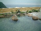 風呂はもう入れるということでした。風呂の時間は朝の4時から夜の11時までで、毎日11時にはお湯を落とすということです。男女の交代があり、夜の8時、朝の8時で変わるそうです。昼間男湯の方は、内湯も露天も広めでなかなかいい感じでした。お湯は熱めで露天の温度計は42.5度を指していましたが、僕の絶対温感によると、43度という印象でした。温度が高いせいか、あまり長湯をする人がおらず、この日は満室ということでしたが、お風呂が込んでいたという感じは受けませんでした。浴場のシャンプー類はすべて炭系のもので固められていました。露天は、湯船に入っても海の見えるもので、申し分ありませんが、海は入り江や熱海の景色などに囲まれて、あまり大海原という感じは受けません。お湯が熱めで、湯船から出てぼーっとする場所もあまりないので、露天にいつまでもいて、開放感にひたるとことは少ししにくいかもしれません。ただ、この露天の大きな特徴は、露天が海に突き出た形になっていて、この露天の下まで波が押し寄せてくることでしょう。海辺の露天にはいくつか入りましたが、湯船の下まで波が来る露天はなかったような気がします。ただ、ここと交替になる風呂は、大浴場も露天も狭目で、ちょっとこことは差が大きいように感じました。露天も、四人くらいで一杯になり、周りに余裕がまったくありませんので、お湯が熱めのこともあり、ゆっくりはできない感じです。風呂の手前に水が用意されていました。この水は「こんこん湧水」とかいう市販のペットボトルを二本、冷水機に逆さに突っ込むという感じのものですが、あまり冷えておらず、そのせいか、水自体もあまりおいしくないような気がしました。それよりも、部屋の洗面所の水を冷蔵庫で冷やしたものの方がおいしかった感じです。 |