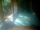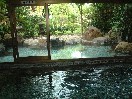 風呂は有名な巨石風呂と巨木風呂とが2・3時間おきに男女交代となり、それぞれ夜中の12時までで、朝は6時からです。これは時間帯を非常にまちがえやすいという欠点があります。この日も意図的ではなかったとは思いますが、時間帯を間違えて入って、裸にタオルを巻いたまま脱衣かごを持って、女性に風呂から追い出された男性がいました。巨石風呂は一つの大岩をくりぬいて浴槽にしたというものです。確かに石自体は大きいのですが、浴槽部分はそれほど大きくはなく、4人が入れるくらいでしょうか。温度がやや高めで、そのせいもあったかと思いますがわりとすぐに飽きてしまいます。また、お湯は湯口から盛んに流れこんでいましたが、浴槽内で吸い込む方式で、かすかな塩素臭もしたこともあり、ここは循環でしょう。敷地は広めに取ってあります。見晴らしのいい角度もあることはあるのですが、屋根が全面を覆っているために、開放感は今一つでしょうか。巨木風呂は一本の巨大な木の幹をくりぬいたというお風呂です。入れるのはせいぜい3人くらいでしょう。敷地は巨石風呂よりは狭く、同じように屋根で覆われ、見晴らせる角度もありませんが、浴槽に入ってみると、やはり木だけあって巨石風呂よりこちらの方が安らぐ感じがあります。湯温が低いせいもあったかもしれません。巨石と巨木のどちらを選ぶと言われたら、ぼくは巨木を選びますね。ただし、巨石風呂のような塩素臭は感じなかったのですが、やはり循環だと思います。 |