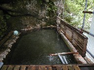 パイプからお湯が流れ、適温になるよう加水され、お湯は半分捨ていています。浴槽からもお湯が溢れています。川原沿いに衝立があるのですが、なければつかりながら景色が見られるのだけれど・・・・。心無い人が多いってことですよね。脱衣所もちゃんとあります。 |